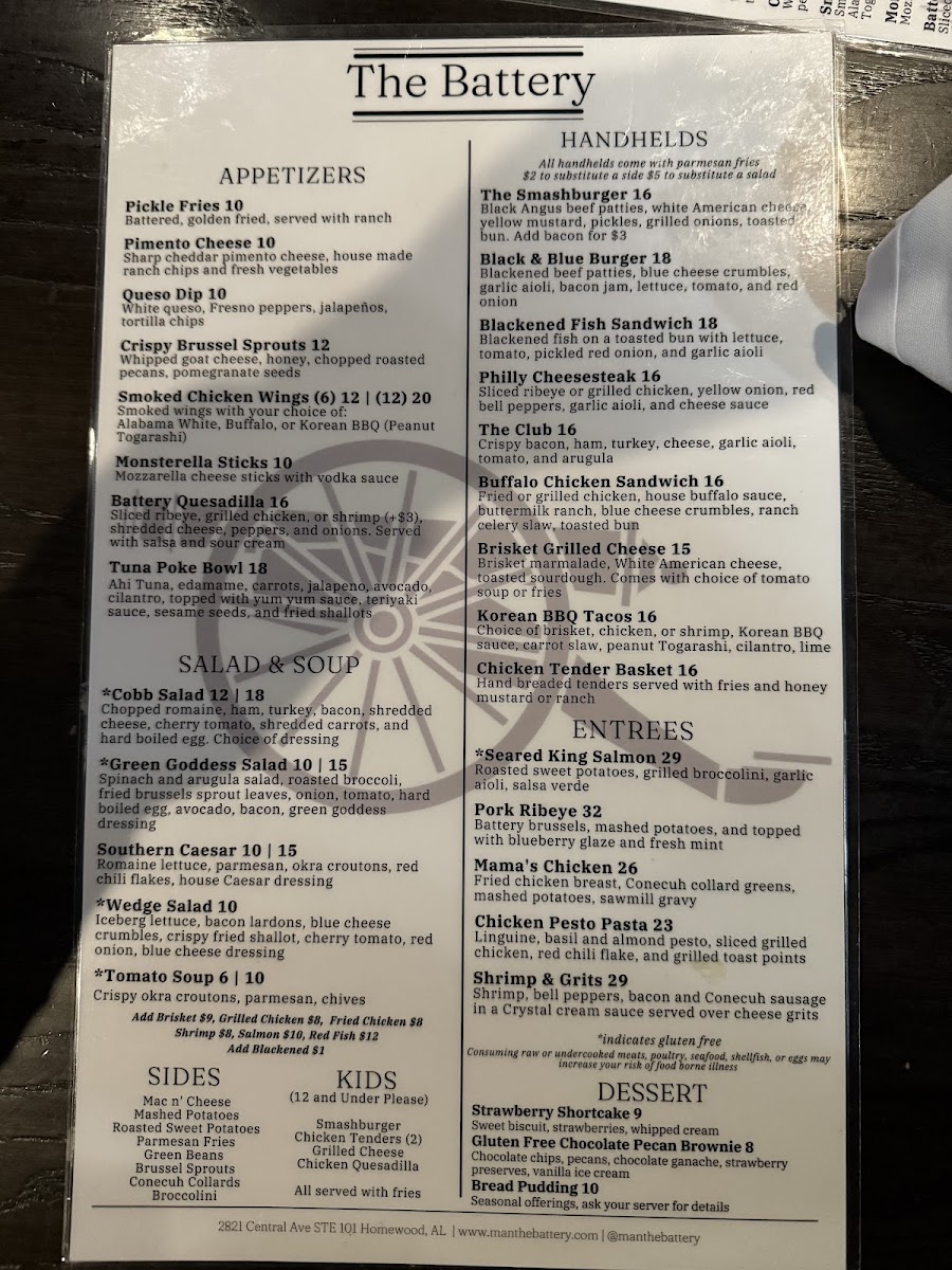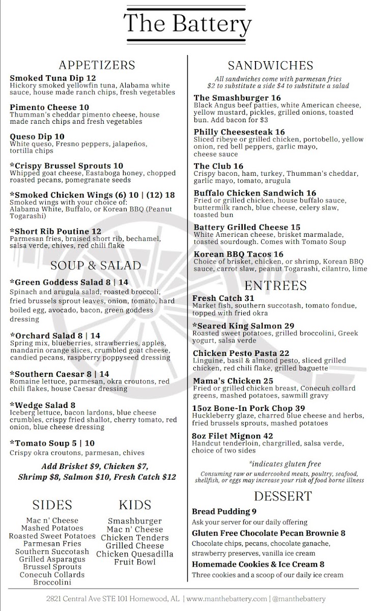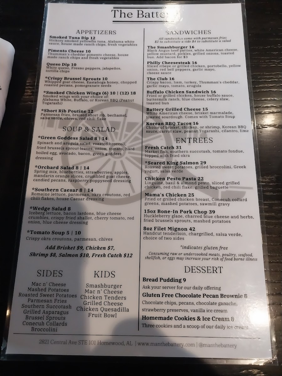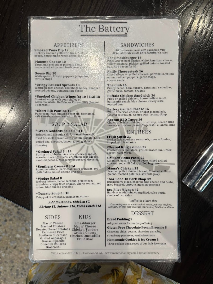 When you're looking for a place that combines great food with a laid-back atmosphere, The Battery Menu has you covered. Located in the heart of Homewood at 2821 Central Ave, this spot offers a mouthwatering selection of dishes that range from comfort classics to inventive new favorites. Whether you're in the mood for a savory burger, a fresh salad, or something more adventurous, you'll find something to satisfy your cravings. Each dish is crafted with care, using quality ingredients that keep guests coming back for more. It's the perfect place to unwind with friends, grab a quick bite, or enjoy a leisurely meal. The warm and inviting atmosphere makes it an ideal choice, whether you're celebrating or just enjoying a casual outing.
